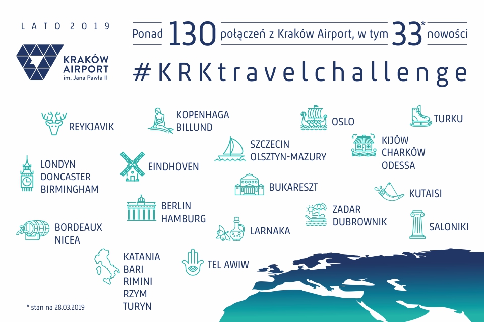 Ponad 130 połączeń #PROSTOzKRAKOWA w tym 33 nowości to prawdziwe wyzwanie na LATO 2019. Z początkiem sezonu letniego Kraków Airport rozpoczyna akcję #KRKtravelchallenge podczas której, chcemy zachęcić wszystkich do odkrywanie nowych miejsc, poszukiwania nowych wrażeń oraz do spojrzenie na podróż przez pryzmat nieoczywistych wyzwań, które możemy podjąć w trakcie naszych wypraw – czy to będzie lot paralotnią w górach Gruzji, udział w winobraniu w Bordeaux, czy też smaki i zapachy włoskich miast … Liczymy na inspirujące relacje pasażerów Kraków Airport!