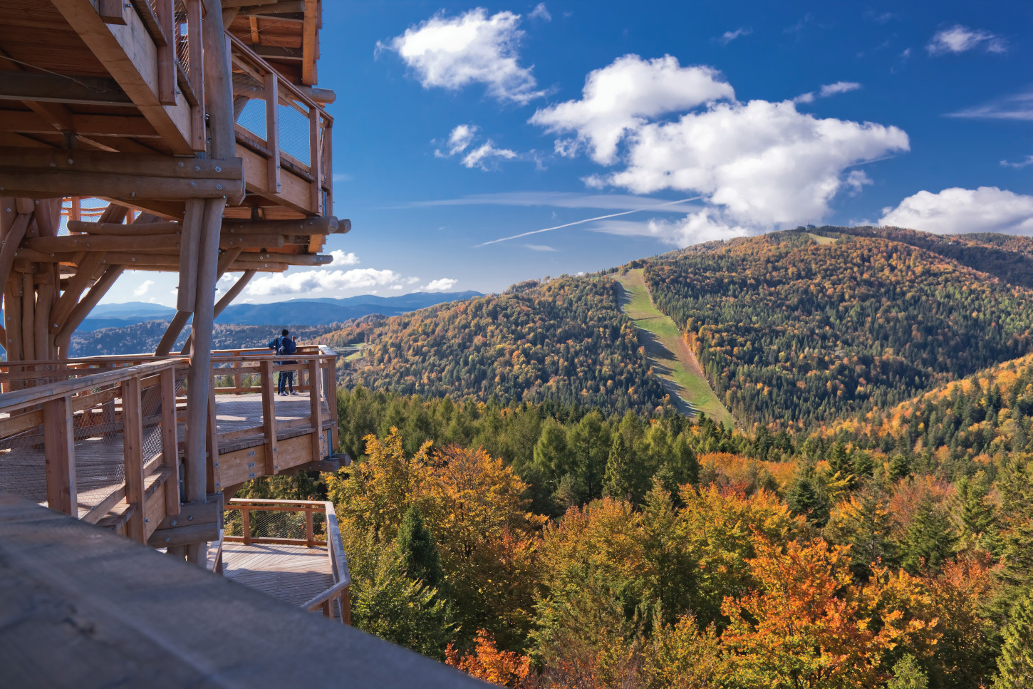Droga na szczyt Początek trasy znajduje się na wysokości 896 m n.p.m. Można ją osiągnąć na dwa sposoby. Pierwszym jest około 40-minutowy spacer pod górę. Przejście nie jest wymagające i można je pokonać nawet z dziecięcym wózkiem, ponieważ droga jest utwardzona. Drugi wariant to wjazd sześcioosobową kolejką krzesełkową, która w razie niepogody ma specjalne przesłony chroniące od wiatru i deszczu. Sam przejazd trwa mniej więcej 8 minut. Dobra rada – jeśli planujecie piesze pokonanie odcinka, nie musicie kupować biletu w dolnej stacji – tu kolejki są większe. Tuż przed wejściem na samą ścieżkę w koronach drzew znajduje się druga kasa, zdecydowanie mniej popularna. Na szczycie na zwiedzających czeka ponadkilometrowa (1030 m) trasa wiodąca przyjemnym, szerokim drewnianym traktem, lekko wznoszącym się ku górze. Kąt nachylenia jest na tyle mały, że pokonując kolejne metry, nie czuje się nachylenia kładki. Dzięki temu można ją bez problemu pokonać z wózkiem dziecięcym. Po drodze widzieliśmy także osobę na wózku inwalidzkim, która również – tak nam się wydawało – spokojnie pokonywała przejazd. Sam spacer jest bardzo przyjemny. Ścieżka wiedzie bowiem wśród starych, wysokich świerków, jodeł i buków. A sam trakt został wybudowany z akacji. Trzeba przyznać, że zarówno konstrukcja, jak i otaczająca ją przyroda robią niesamowite wrażenie bliskości z naturą. Sama konstrukcja jest bardzo solidna – wspiera ją 18 wież i 87 słupów. Jako osoba z lękiem wysokości pierwotnie obawiałam się przejścia – jednak zupełnie niepotrzebnie. Ścieżka jest szeroka a barierki solidne.