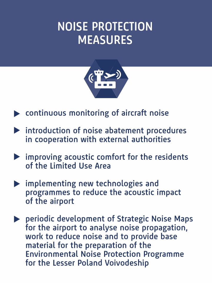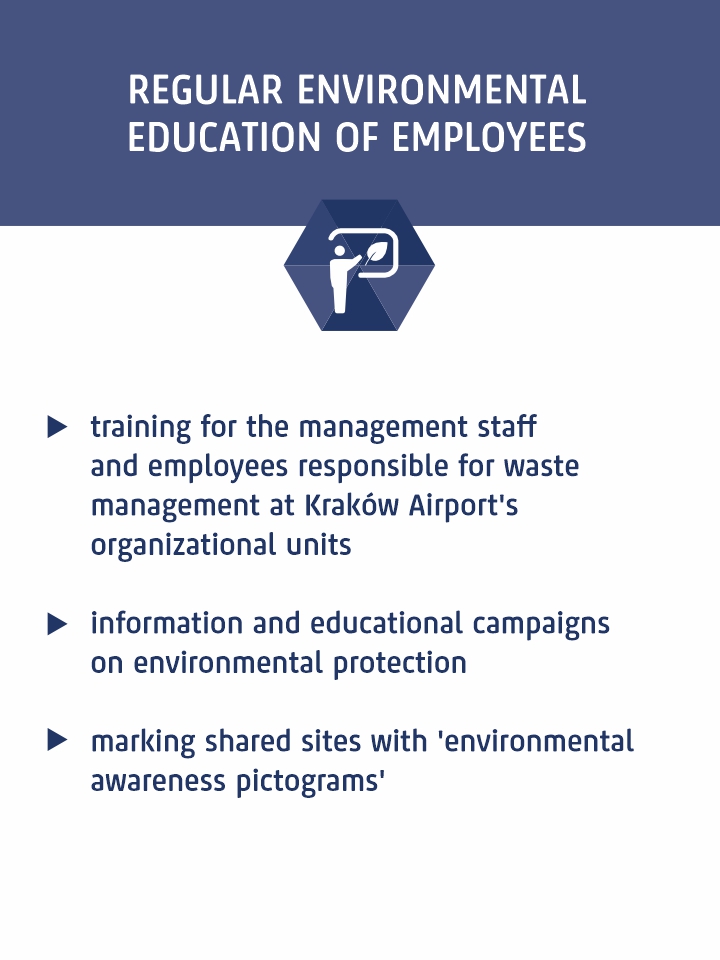 Kraków Airport conducts its business activities with respect for the principles of sustainable development and accounting for environmental protection. Activities undertaken by the airport include running a selective waste collection programme at the airport, implementing energy-saving solutions when carrying out new investments and modernizing existing facilities, and running campaigns to build environmental awareness among employees.
