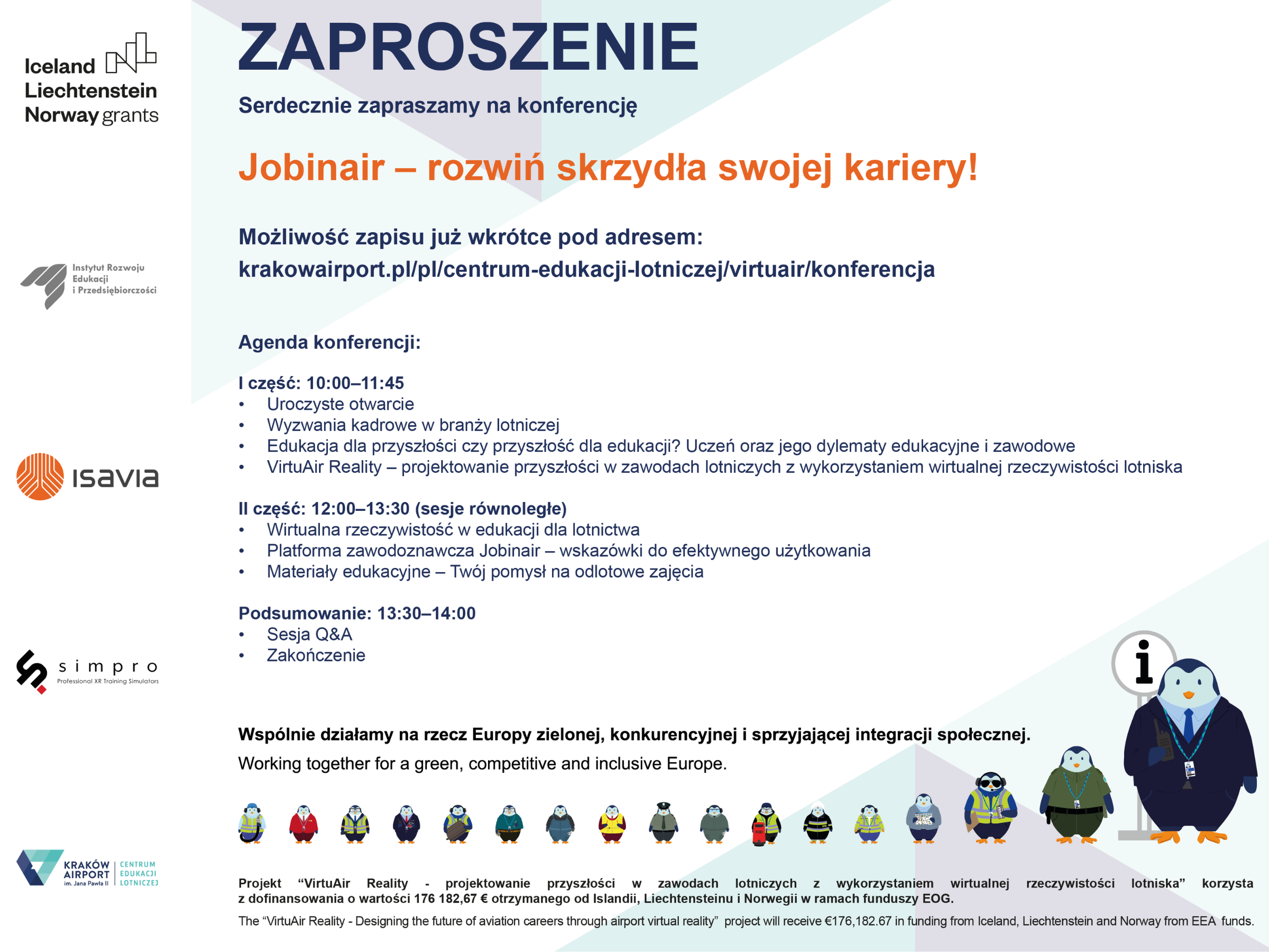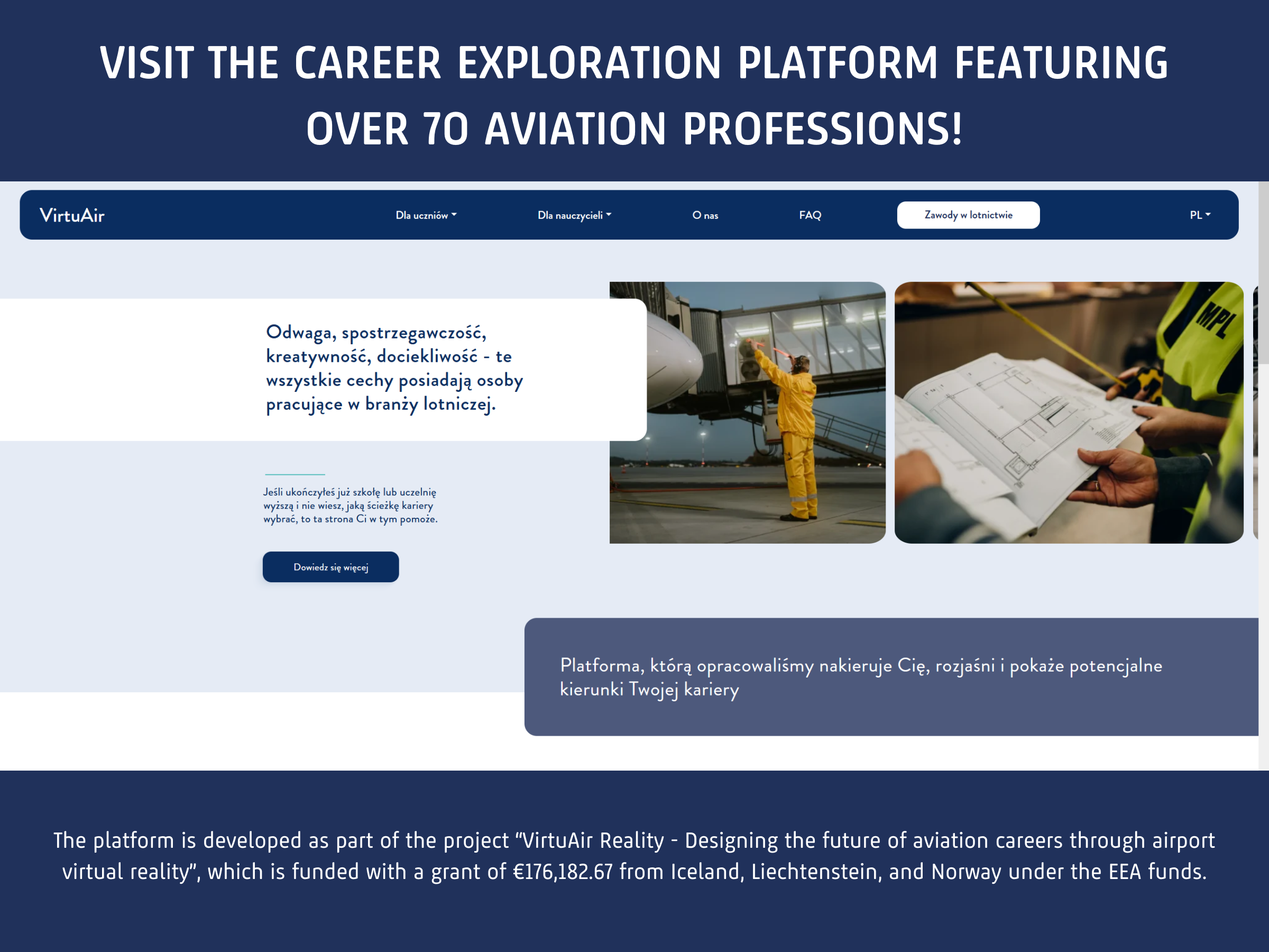 ✔️ The platform was developed as part of the “VirtuAir Reality – Designing the Future in Aviation Professions Using Virtual Reality of the Airport” project, funded by a grant of €176,182.67 received from Iceland, Liechtenstein, and Norway through the EEA Grants.