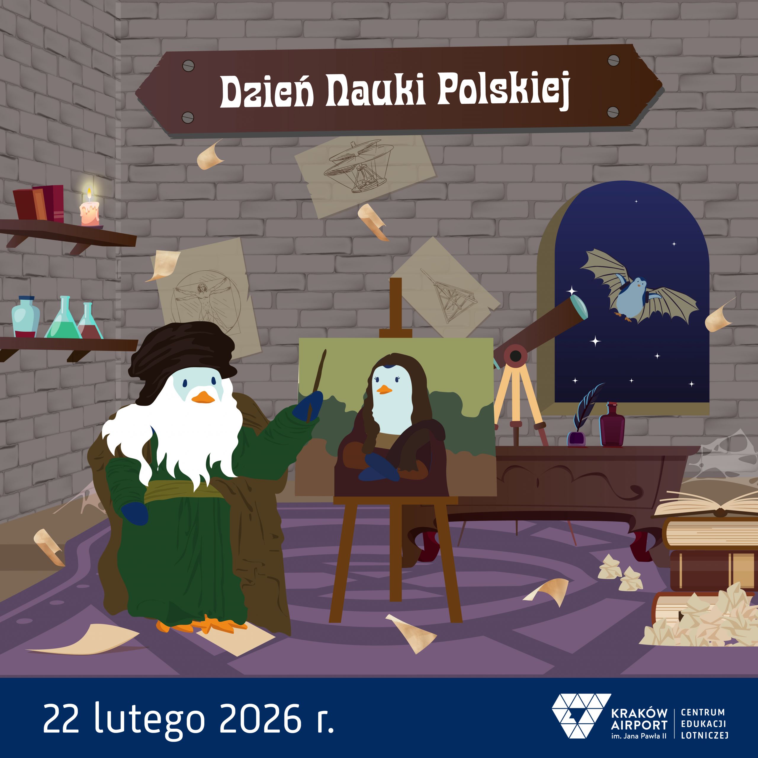 Dlatego właśnie w Dzień Nauki Polskiej wkroczycie do pracowni Leonarda - miejsca, w którym sztuka spotyka się z nauką, a marzenia o lataniu nabierają realnych kształtów. Wśród szkiców, mechanizmów i tajemniczych notatek odkryjecie kolejne stacje poświęcone jego życiu i badaniom: od obserwacji lotu ptaków, przez mechanikę skrzydeł, aż po śmiałe projekty maszyn latających.