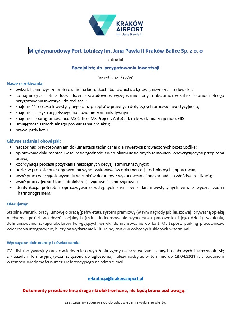Specjalista ds. przygotowania inwestycji Pobierz dokumenty rekrutacyjne: Klauzula informacyjna oraz zgoda na przetwarzanie danych